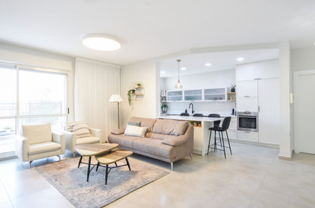 בחלל הציבורי החלפנו את חזיתות המטבח, הוספנו אי גדול כשטח אחסון, עבודה וישיבה, החלפנו ריצוף במפלס הקרקע ובחצר, תאורה, ריהוט וטקסטיל.